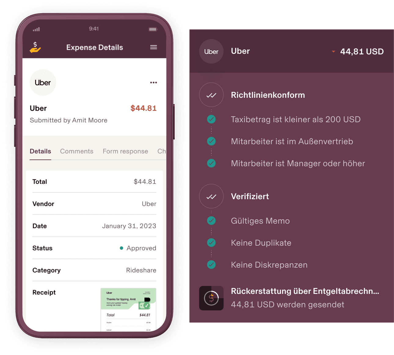 auf der Basis von vordefinierten Unternehmensrichtlinien und -Workflows zur Genehmigung weitergeleitet. Die Richtlinien und Workflows können mithilfe von Regeln konfiguriert werden, die auf diversen Faktoren basieren, wie Abteilung, Ausgabentyp oder Betrag. Viele Systeme umfassen außerdem Firmenkreditkarten-Transaktionen. Und schließlich erleichtert die Software den Prozess der Spesenrückerstattung, indem diese Zahlungen direkt an den Mitarbeiter gesendet werden.