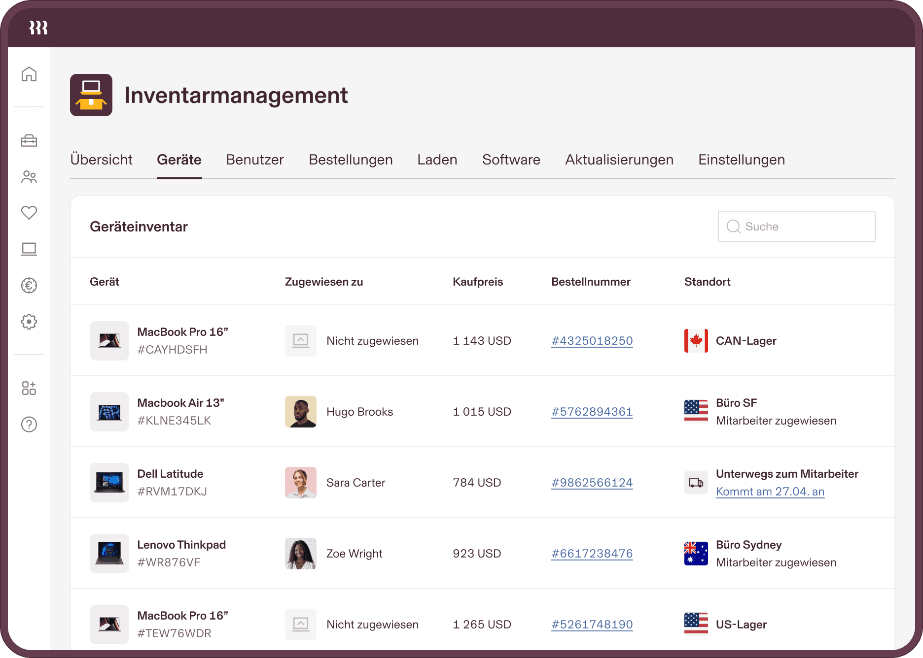 Selbstverständlich. Mit der Inventarmanagement-Software von Rippling kann ein Unternehmen die Last der Verwaltung seiner physischen Assets abgeben, z. B. den Versand neuer oder gebrauchter Laptops, die Verfolgung von deren Zustand, die Lagerung von Geräten in Drittlagern und die Neuzuweisung ungebrauchter Geräte. Die Software sorgt für umfassende Kontrolle und transparente Einblicke in Ihre Geräteflotte, sodass Sie neue oder ungebrauchte Geräte automatisch an neue Mitarbeiter versenden lassen können, die Geräte von ausscheidenden Mitarbeitern wieder zurückholen lassen und die Sicherheit, Updates und den Zustand eines jeden einzelnen Geräts genau auf Ihrem Geräte-Dashboard überwachen können.