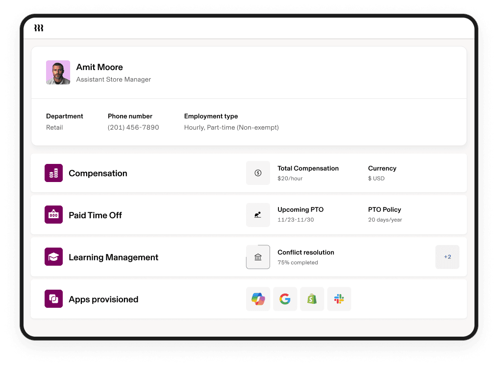 For seasonal retail employees who return year after year, rehiring is just as simple. Instead of starting from scratch, Grace reactivates profiles in minutes. "We're lucky that many seasonal employees come back, and Rippling makes rehiring so much easier than starting from scratch," Martin said. "It saves time for HR, but it also makes training and onboarding much easier for the store teams."