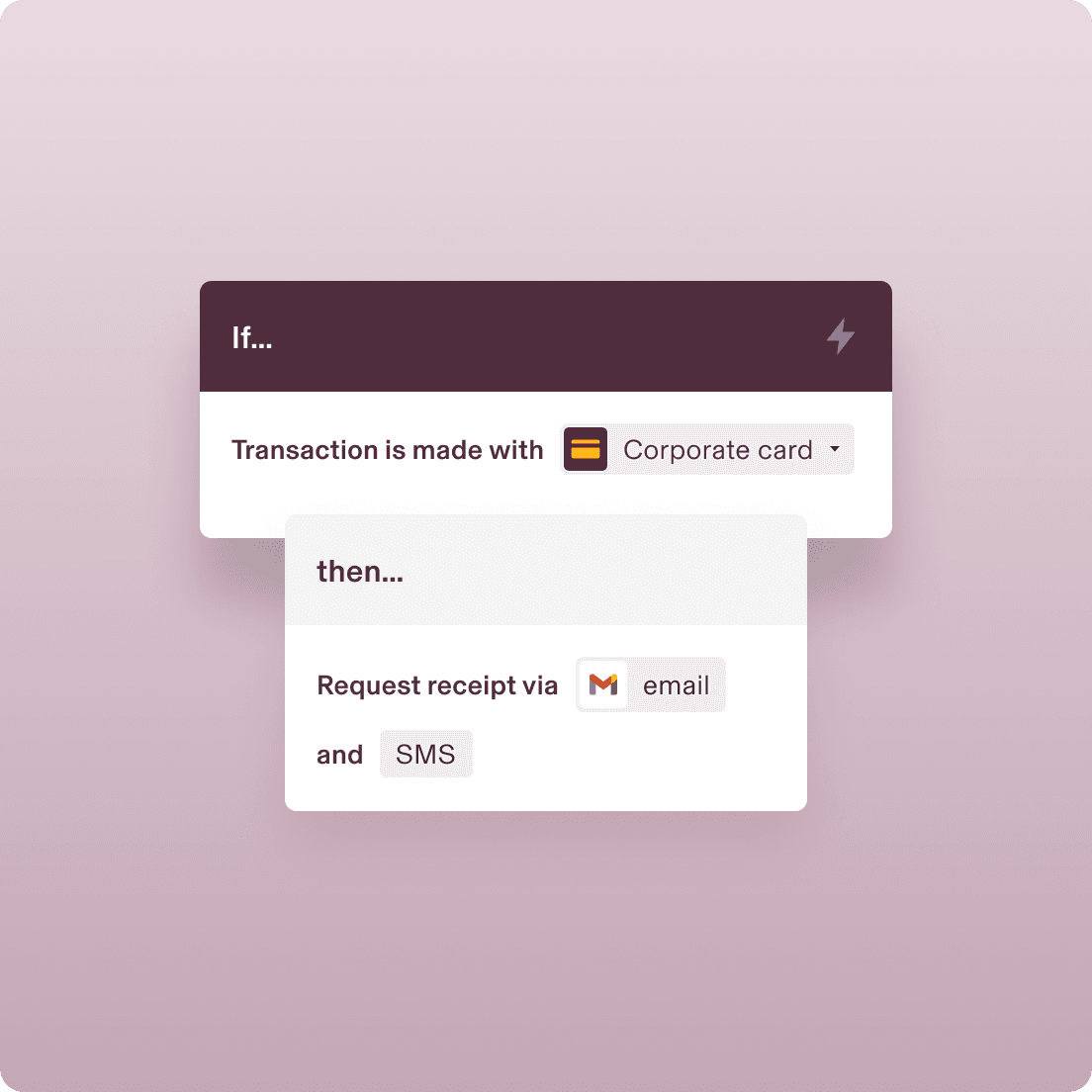 Envoyez automatiquement par texto et courriel des demandes de reçus requis pour chaque achat effectué au moyen d’une carte d’entreprise.