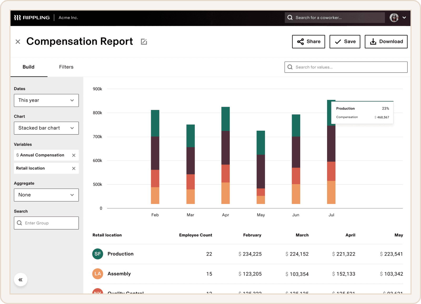 Grâce au moteur de création de rapports performant et facile à utiliser de Rippling, votre équipe dispose des informations dont elle a besoin pour prendre des décisions judicieuses en matière de recrutement et fournir des rapports d'audit détaillés à des fins de conformité.