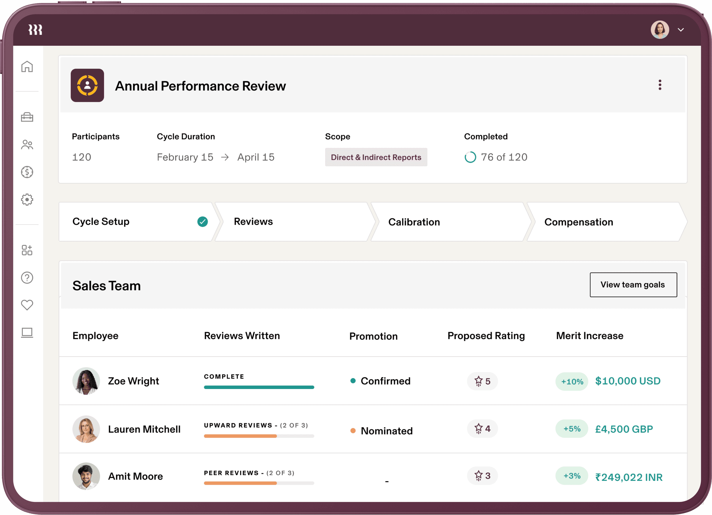 Collaborate on ratings, promotions, and raises. Effortlessly sync approved changes to payroll.