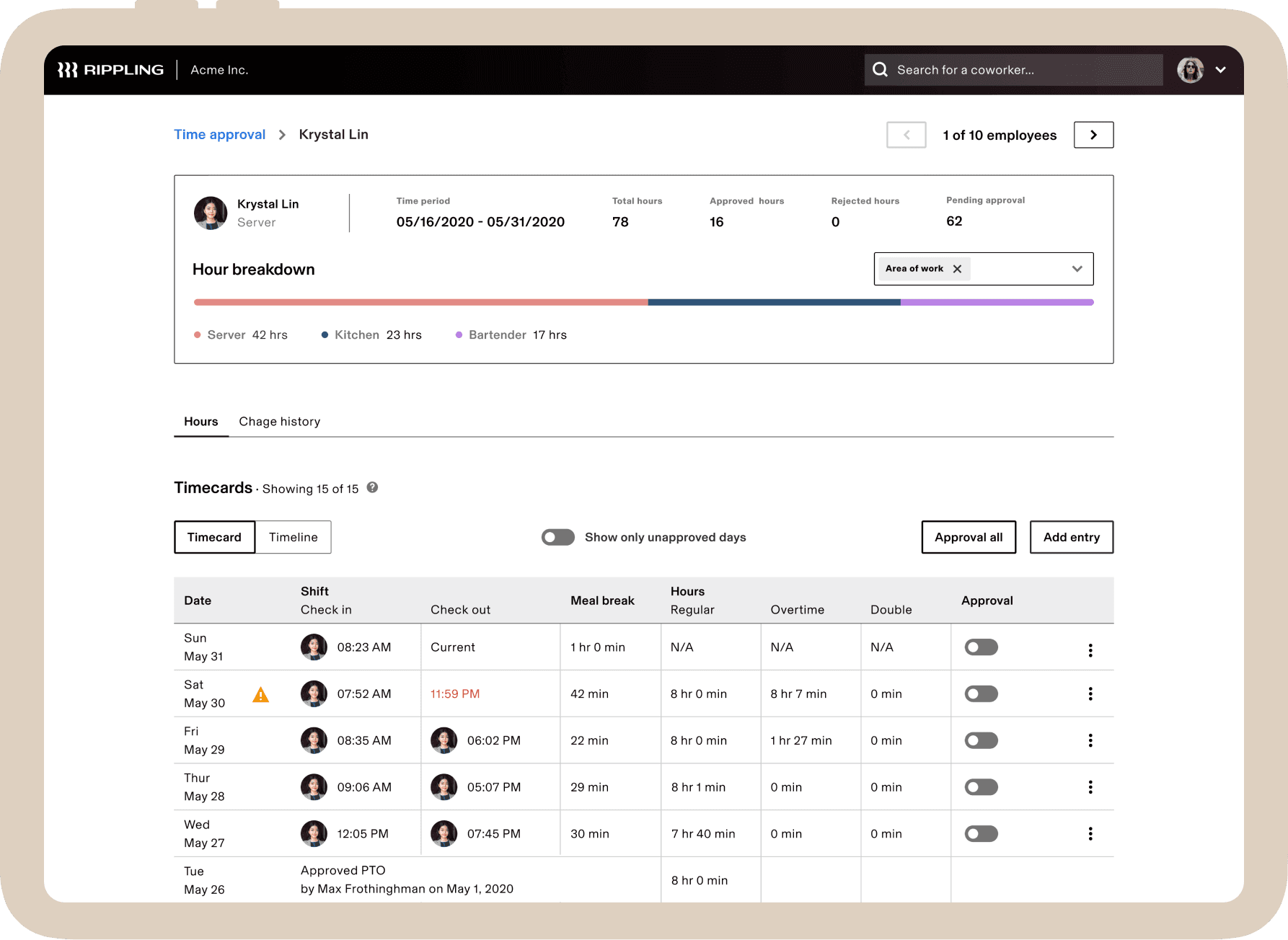Rippling Payroll practically runs itself. Everything is auto-calculated, from hours worked to tax deductions. You just need to click "Run."