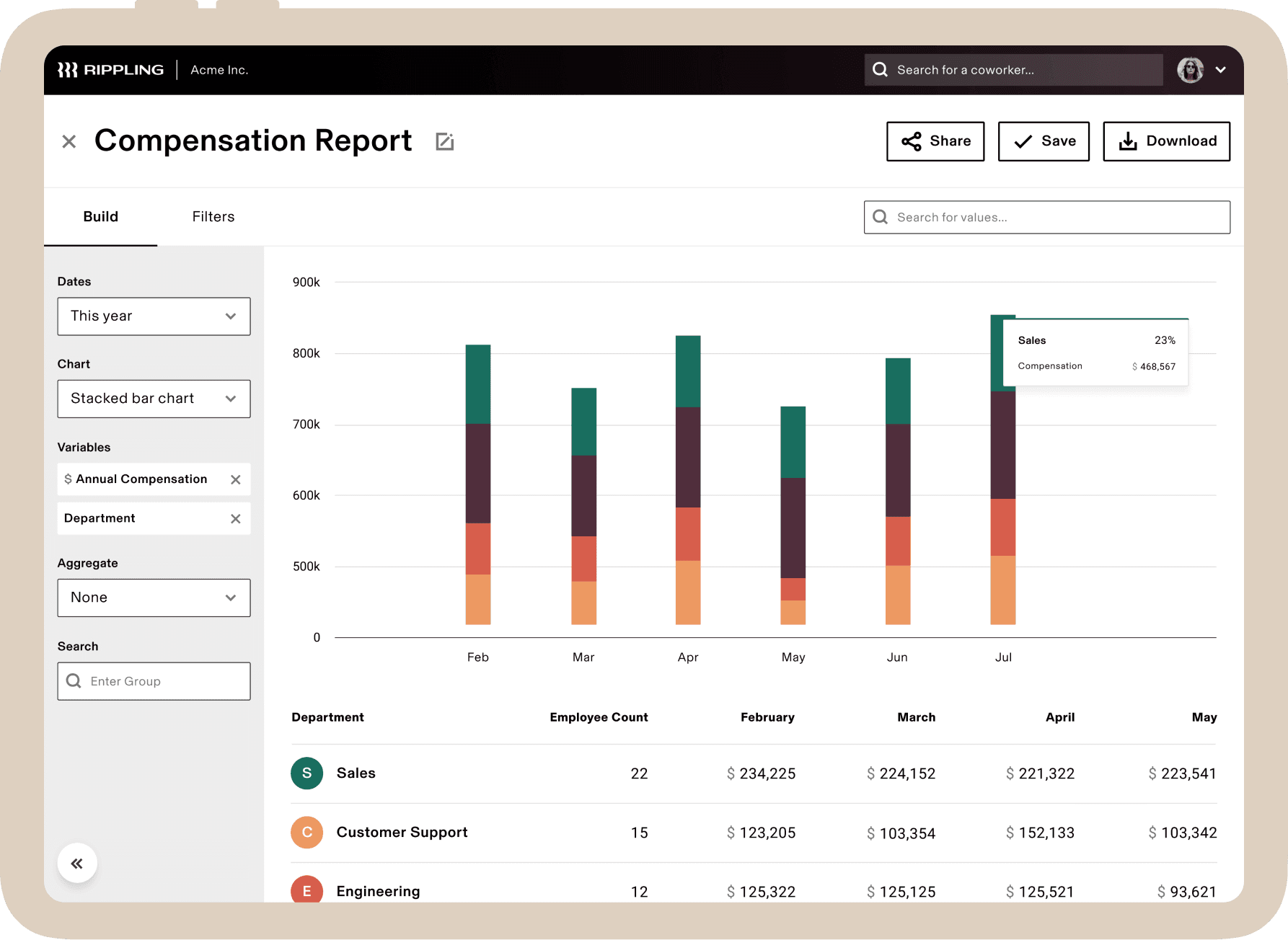 Turn any information in Rippling into compelling reports, whether custom or built with one of our existing templates.