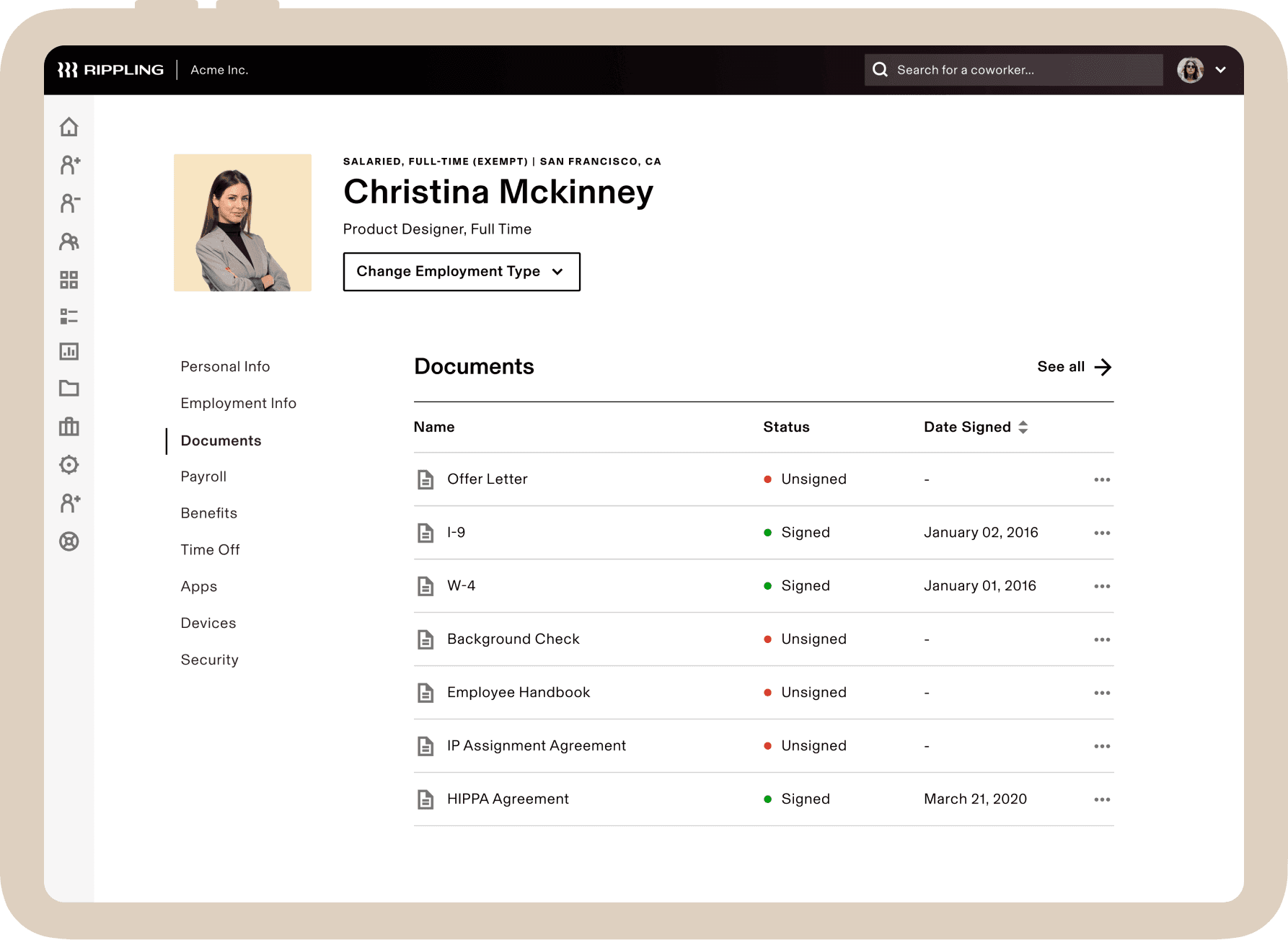 From I-9s to W-2s, Rippling helps you handle your tax and compliance work, keeping your business compliant with the right forms, laws and regulations.