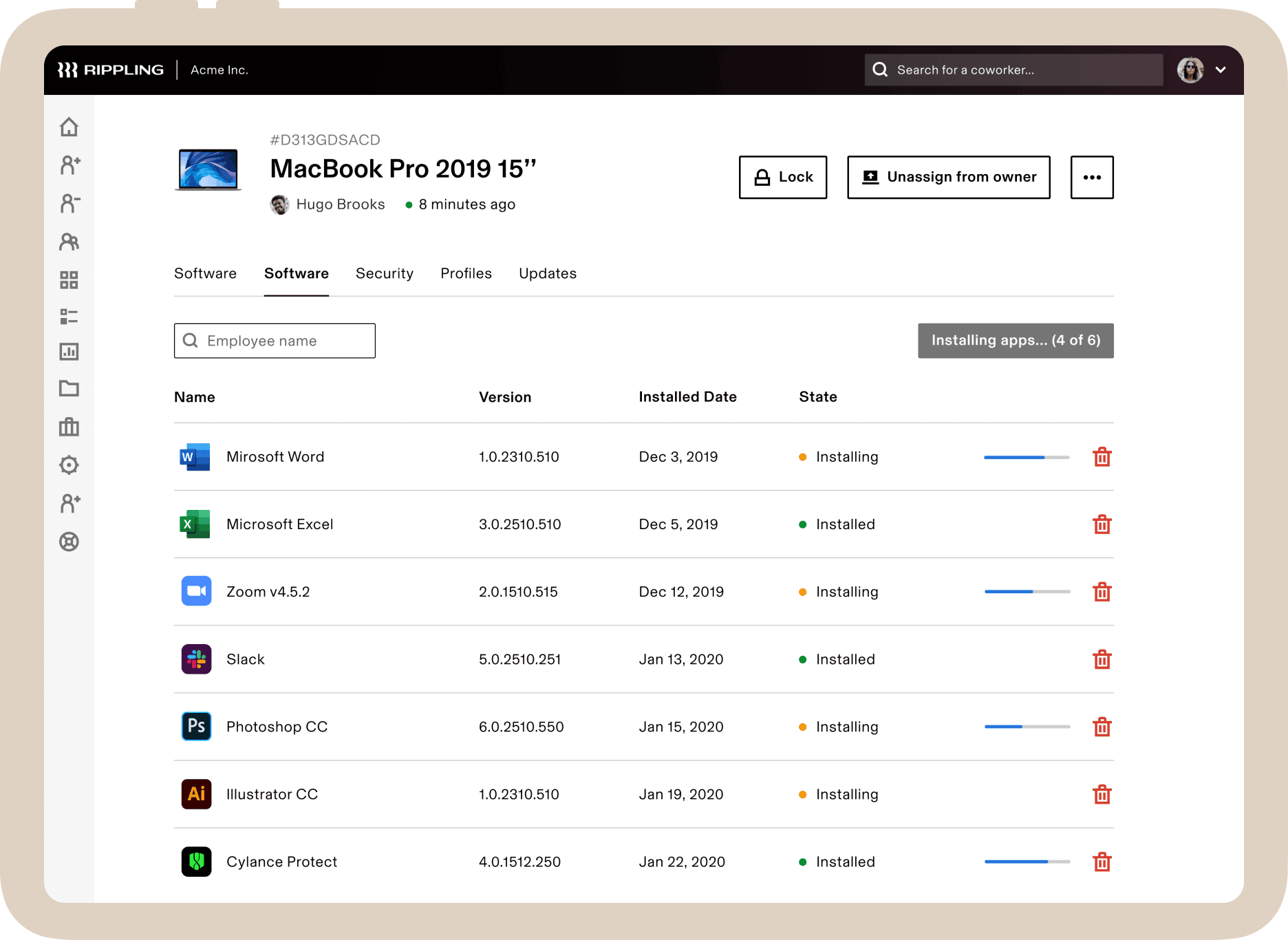 Rippling's add-on IT software lets you easily manage employees' laptops and apps, like Slack, Microsoft 365, and more.